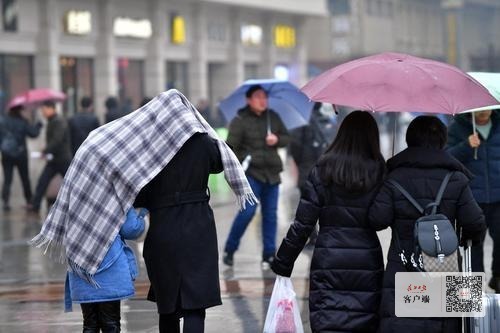 近日,汉口火车站广场,两位行人将围巾展开披在头上,遮挡丝丝细雨。记者李永刚 摄